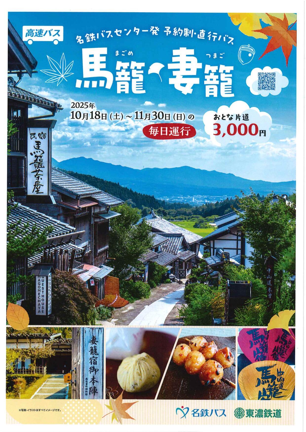 名鉄バス株式会社と共同で高速バス「名古屋~馬籠・妻籠線」を2025年10月18日(土)から11月30日(日)まで毎日運行いたします。名古屋から馬籠宿・妻籠宿をダイレクトに結ぶことで、各宿場町をめぐる日帰り旅行も可能です。また、馬籠~妻籠間(約8.3㌔ 約3時間)を歩いてお楽しみ頂く事も出来ます。(中山道ウォーク)