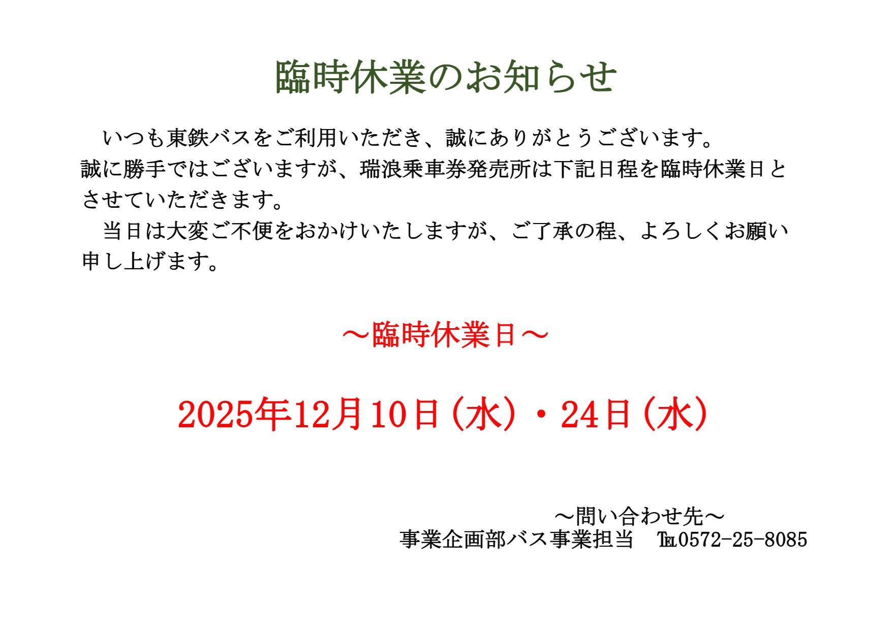 【12月10日・24日】瑞浪乗車券発売所:臨時休業のお知らせ