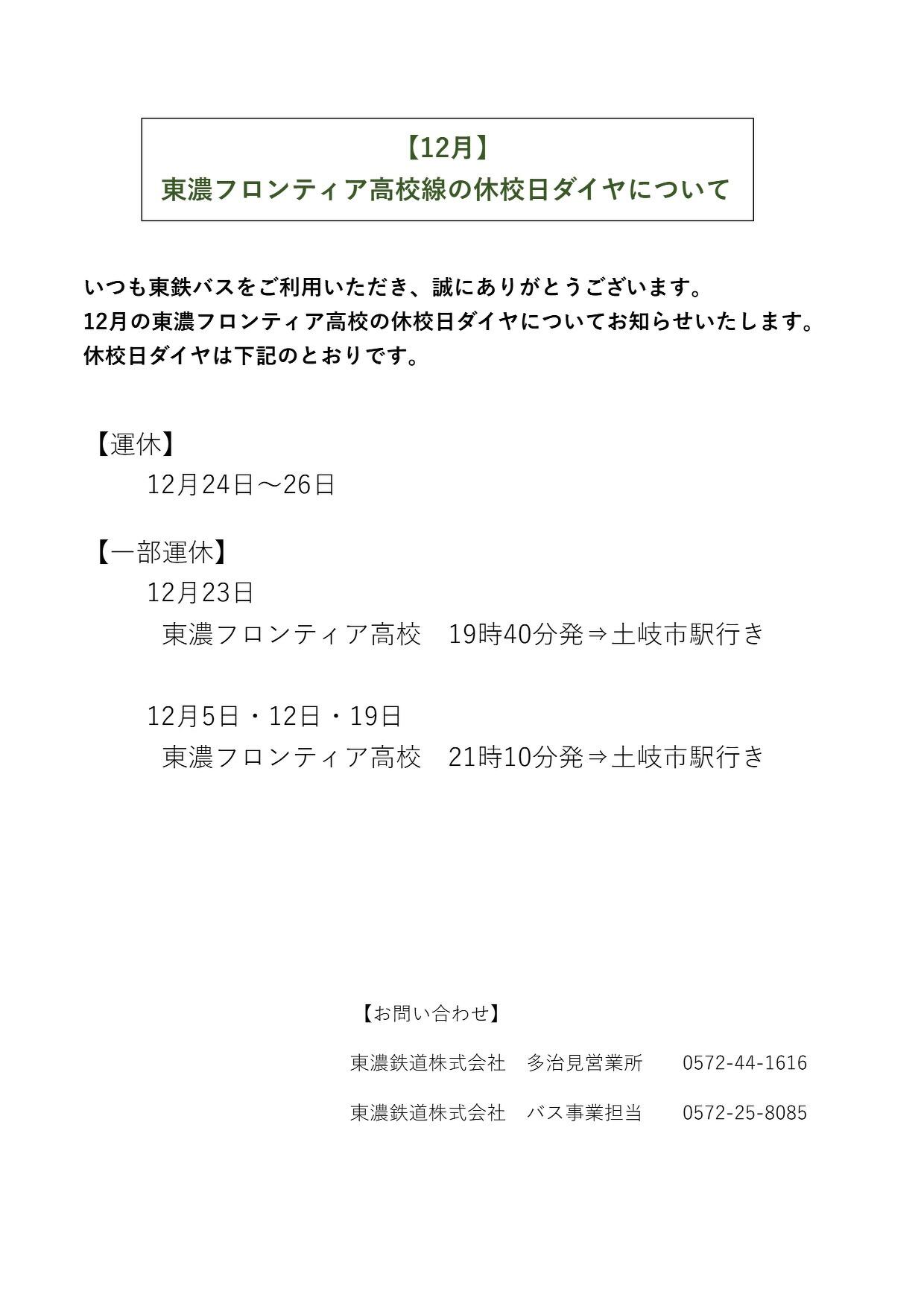 【12月】東濃フロンティア線の休校日ダイヤについて