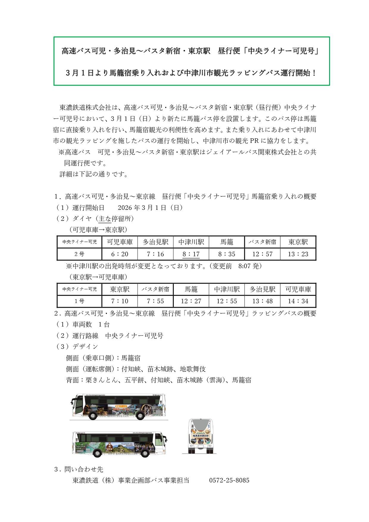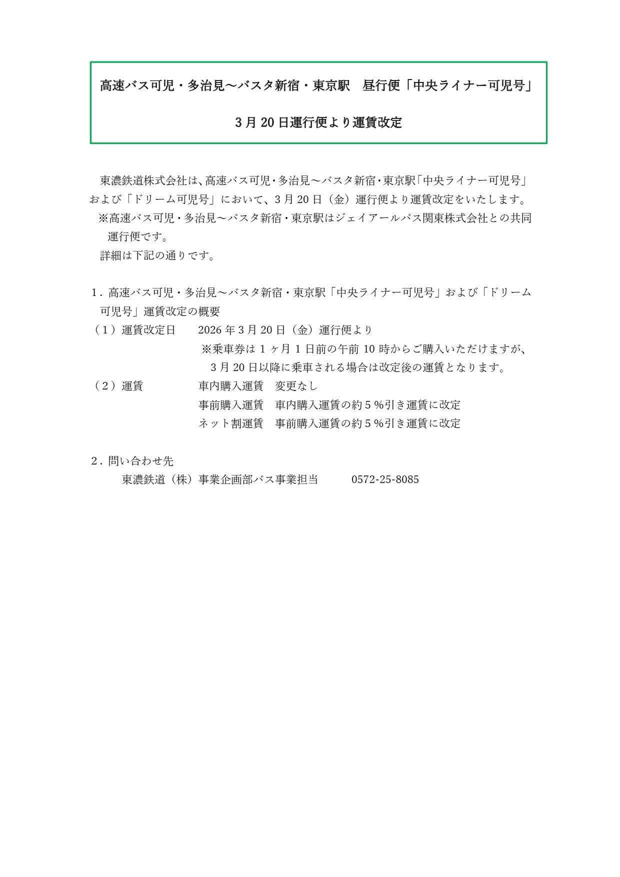 「中央ライナー可児号」のダイヤ改正および「中央ライナー可児号」「ドリーム可児号」の運賃改定について