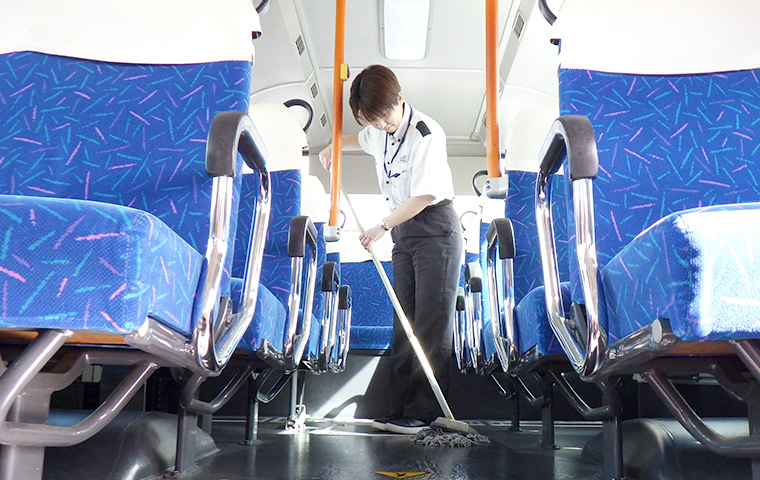 一日の乗務を終えて営業所に戻ります。次に乗務する運転士のため、給油、洗車、清掃等を行います。