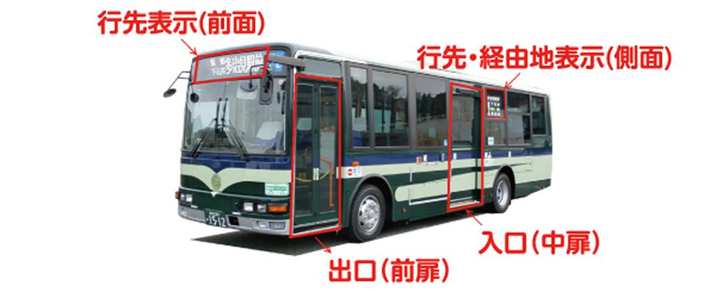 - バスの行先は車両前面上部・後面と側面中扉付近に表示しています。側面は行先の他、主な経由地を表示しています。
