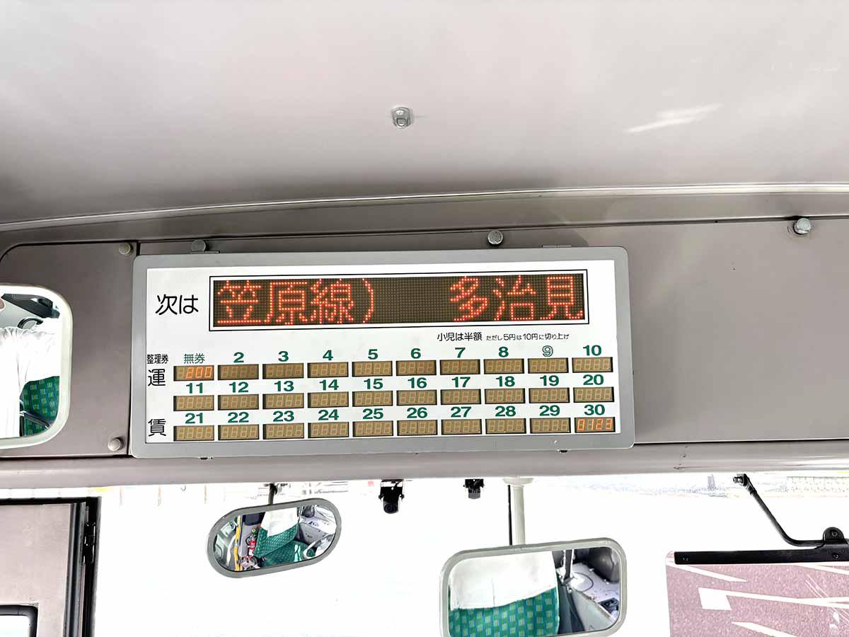 - 運賃は車内前方にあります「運賃表示機」で確認できます。お手持ちの整理券番号の下に表示されている金額が大人運賃となります。