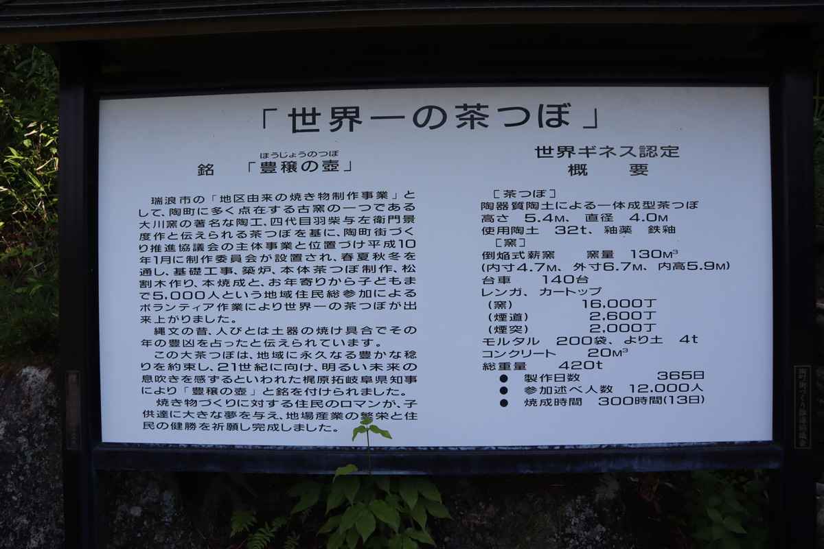 ギネス認定・第2弾!世界一の茶つぼです。平成11年に世界一のこま犬のとなりに、のべ12000人もの地域の皆さんの力で生まれました。高さ5.4m・直径4.0m、使用した陶土はなんと32トン!!地域に永久なる豊かな稔りと明るい未来を約束するという意味で、 『豊穣の壺』と名付けられました。