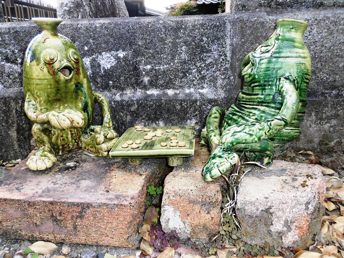 下石裏山地区の窯元エリアに、囲碁をしたり、お茶を飲んだり、煙突に登ったりいろいろなことをしている「とっくりとっくん」が佇んでいます。マップを片手に探してください。