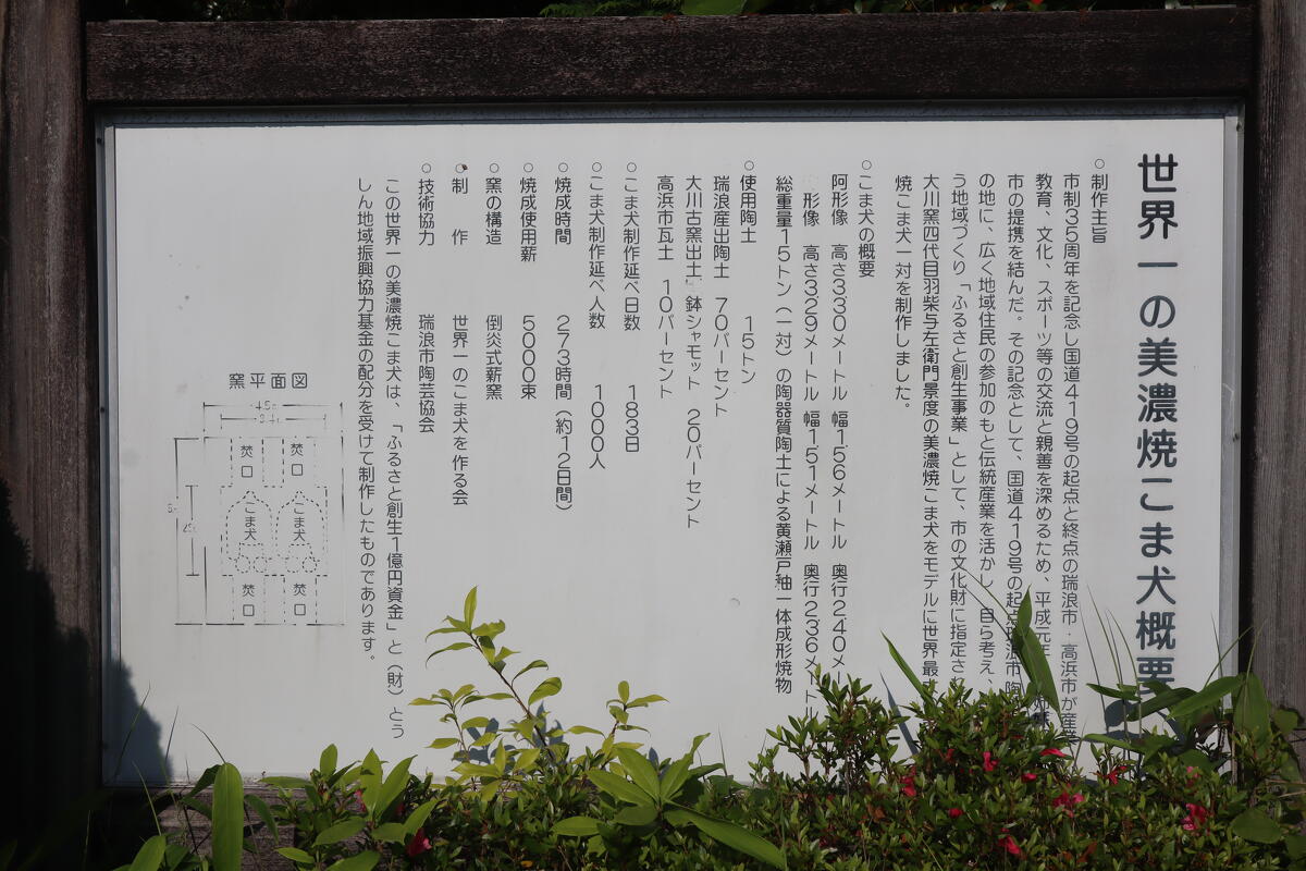 瑞浪市に3箇所ある、ギネス認定の世界一がここ陶町大川に2箇所あります。美濃焼のこま犬と、茶つぼ「豊穣の壺」です。“世界一”と称するだけあり、その大きさには皆さん驚かれることでしょう。ちなみにこま犬は高さ3.3mが一対、茶つぼは高さ5.4m、直径4mのサイズです。また、陶与左衛門窯は国内最大級の六連房式登り窯で、年に一度、工房で作られた作品を中心に、五日間かけて焼成を行います。これらの名所はそれぞれ近くにありますので、徒歩で移動して見学できます。陶町の焼き物文化と触れ合ってみてください。