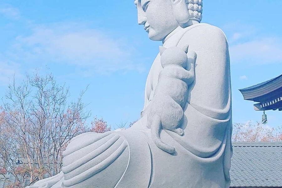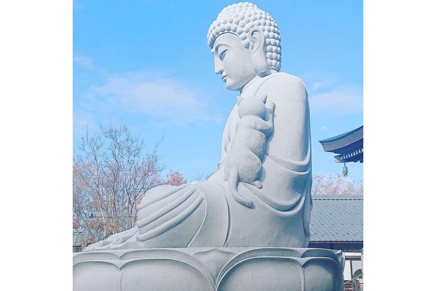 膝や肩に可愛らしく猫が乗っている珍しい大仏様は必見です!